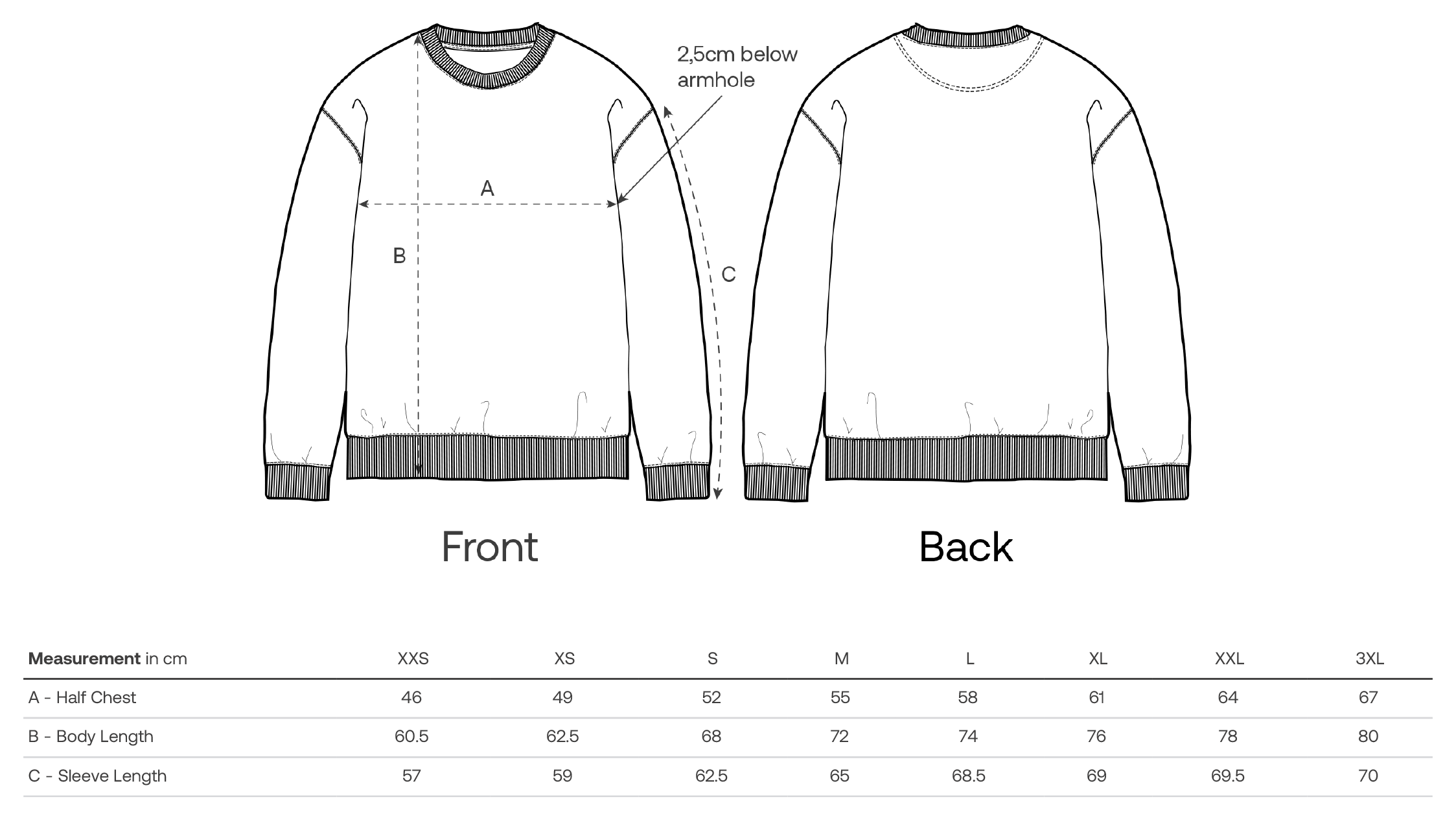 - 1x1 rib at neck collar, sleeve hem and bottom hem